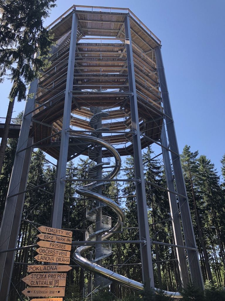 Zabudli sme na niečo? Áno, zabudli sme na tobogán! Tak tým sa môžete za poplatok zviezť až skoro z vrcholu veže dole, pričom jeho dĺžka je krásnych 52 metrov a prekonáte ním výšku 24 metrov. Táto obrovská šmykľavka je najdlhší tobogán svojho druhu v Českej republike a zaručí vám ďalší z krásnych zážitkov. Ak patríte do skupiny, ktorá miluje adrenalínové zážitky, na vrchu sa dajú zapožičať kolobežky, ktorými sa vybudovanou trasou dostanete až dole k parkovisku. Verte mi, stojí to za to 🙂